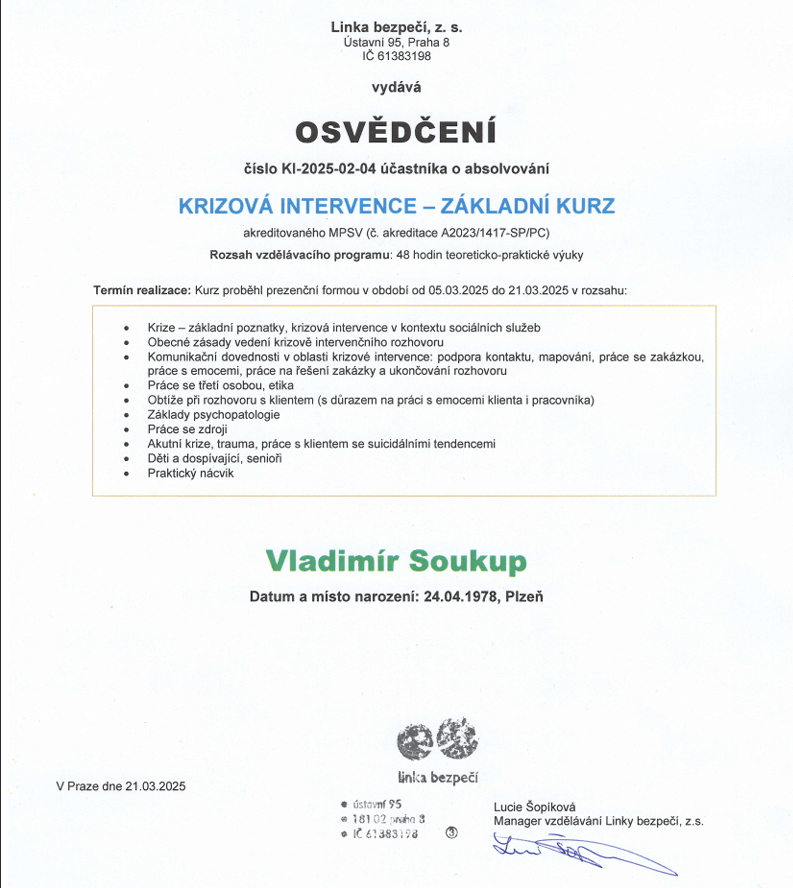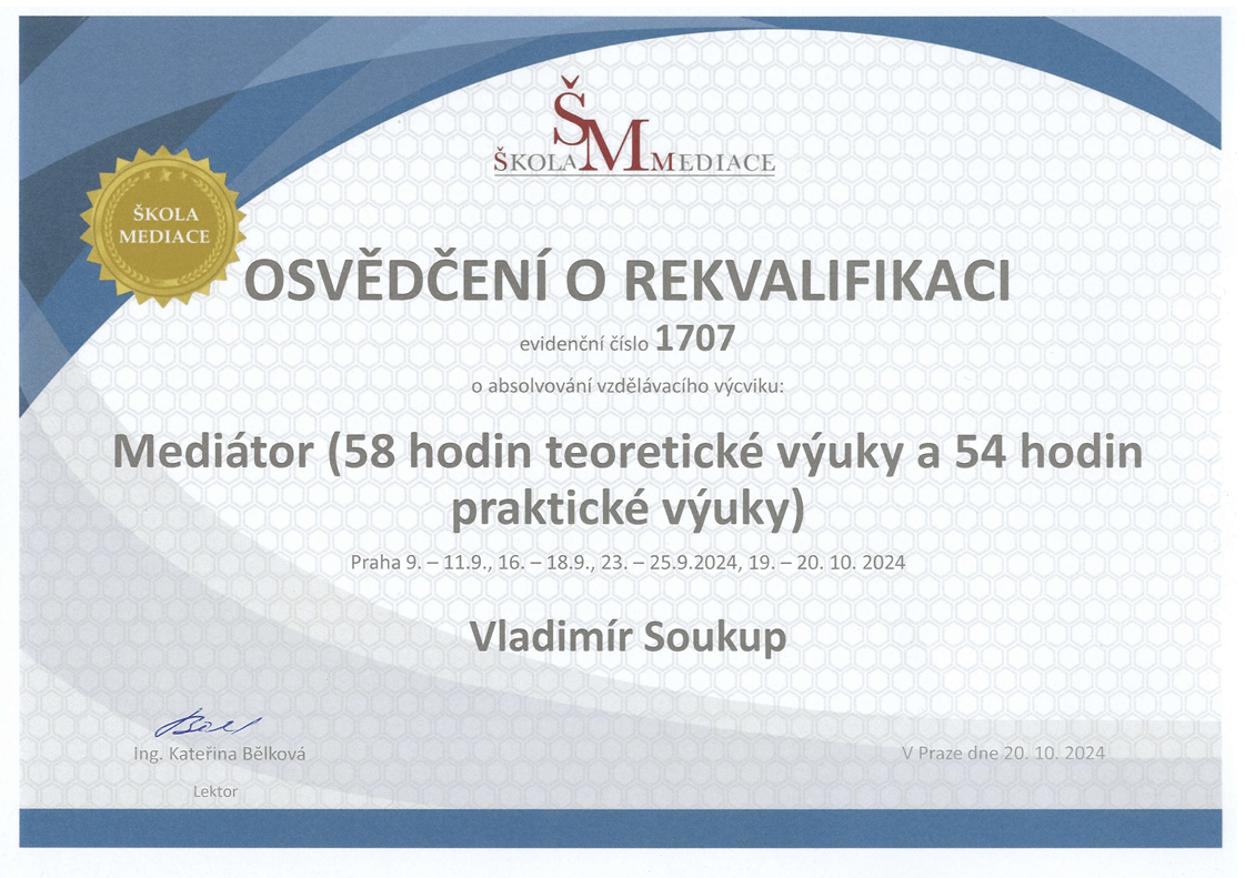 Jmenuji se Vladimír Soukup a moje cesta k mediaci a následně krizové intervenci byla motivována touhou pomáhat lidem v těžkých životních chvílích. Jsem přesvědčený, že každý konflikt a každá krizová situace má svou řešitelnou cestu. Ať už jde o rodinné neshody, pracovní spory nebo osobní krize. Věřím, že každý má právo na to, aby byl vyslyšen a pochopen.
